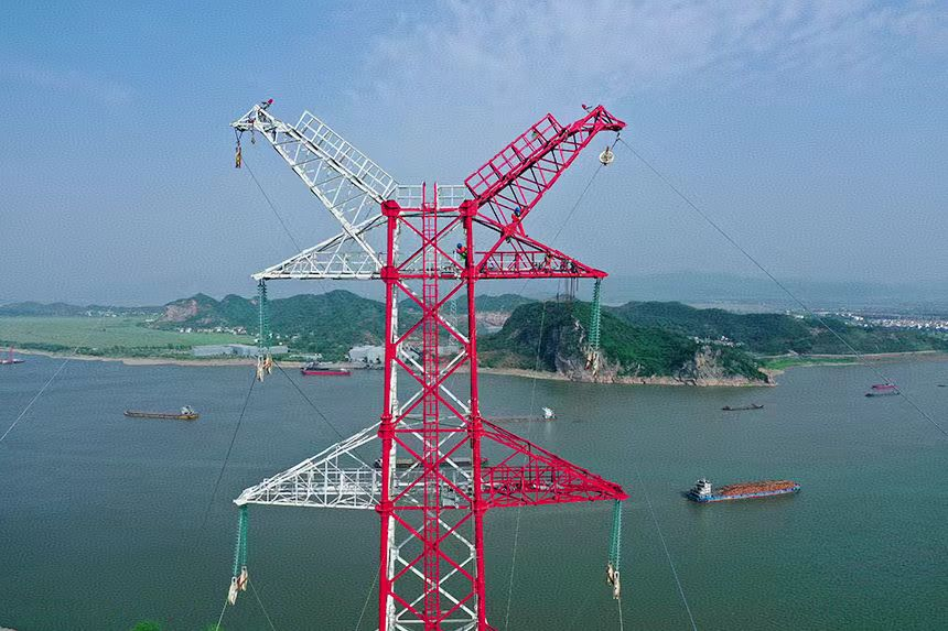 棉船風(fēng)電項(xiàng)目送出工程長江大跨越段,一舉創(chuàng)下江西省內(nèi)110千伏線路跨越長江的三項(xiàng)之“最”:172.8米的桿塔刷新省內(nèi)高度紀(jì)錄;近2公里的跨距成為省內(nèi)同電壓等級線路之最;采用的新型導(dǎo)線兼顧高強(qiáng)度與輕量化,在保障輸電能力的同時(shí)實(shí)現(xiàn)技術(shù)突破。其中,長江大跨越放線作業(yè)堪稱項(xiàng)目建設(shè)的“頭號難關(guān)”,施工區(qū)域位于長江馬當(dāng)嘴水域,此處航道狹窄、水流湍急,再加上氣象條件瞬息萬變,給放線工作帶來巨大挑戰(zhàn)。
