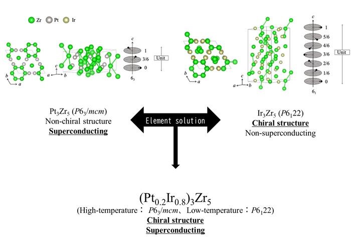 東京都立大學(xué)團(tuán)隊(duì)此次引入了一種全新的方法尋找手性化合物。他們沒(méi)有梳理化合物列表,而是混合了兩種具有已知物理性質(zhì)的化合物。其中一種是具有超導(dǎo)性但沒(méi)有手性的鉑鋯化合物,另一種是具有手性但沒(méi)有超導(dǎo)性的銥鋯化合物。將兩種化合物以不同的元素比例組合在一起,能有效地“混搭”物理性質(zhì),從而提出一種同時(shí)具有手性晶體結(jié)構(gòu)和超導(dǎo)性的新材料。