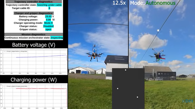 一旦找到電源線,無人機(jī)將自主飛行至線路下方,通過特制的手臂將電纜引導(dǎo)入夾具中,隨后感應(yīng)充電器開始從電線上汲取電能。當(dāng)電池充滿后,夾具會(huì)自動(dòng)釋放,無人機(jī)繼續(xù)執(zhí)行其任務(wù)。這項(xiàng)技術(shù)最初的設(shè)計(jì)目的是為了支持電力線路檢查無人機(jī)在執(zhí)行任務(wù)時(shí)能夠自我充電。