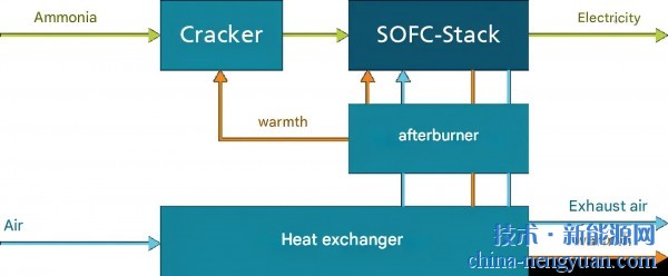 在這個過程中,氨首先被調節(jié)并送入裂化裝置,在那里它被加熱到300攝氏度或更高的溫度。作為反應,它分解成氫(H2)和氮(N2)。當這個過程完成后,氮可以簡單地與水蒸氣一起作為無害的廢氣釋放出來。然后,氫氣被送入高溫燃料電池(SOFC)。在陶瓷電解質中,它流過陽極,而氣流流過陰極。氫分裂釋放出從陽極到陰極的電子。電流就是這樣開始流動的。除了水蒸氣,這種電化學反應還產(chǎn)生熱能。這些熱量被用來保持裂解爐內(nèi)部的高溫,一部分作為廢熱釋放出來,能夠用于某些目的。